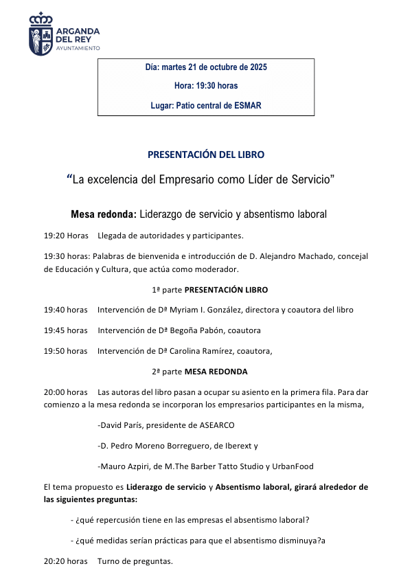 El acto, organizado por el Ayuntamiento de Arganda del Rey, contará con la intervención del concejal de Educación y Cultura, Alejandro Machado, e incluirá una mesa redonda bajo el título “Liderazgo empresarial y absentismo laboral”. Este espacio para el debate abordará desafíos de nuestros tiempos como lo es, por ejemplo, la gestión del talento en las organizaciones.