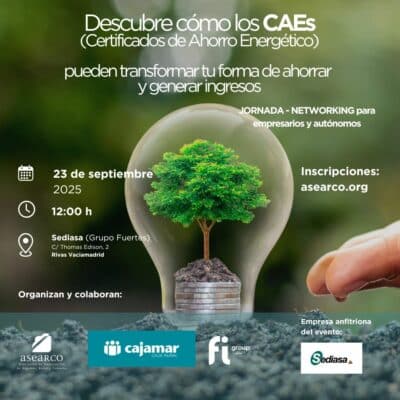La Banca Cooperativa Cajamar y ASEARCO organizan la sesión informativa “Descubre cómo los Certificados de Ahorro Energético (CAEs) pueden transformar tu forma de ahorrar en la empresa y generar ingresos”.