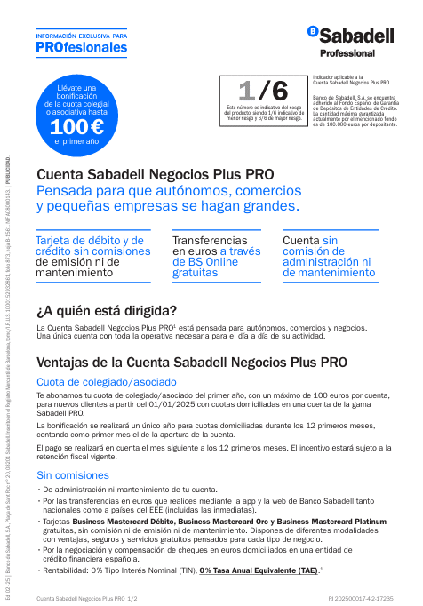 Esta cuenta también abre la posibilidad de disfrutar de una bonificación del 100% de la cuota de ASEARCO (con un máximo de 100 euros por cuenta el primer año), siempre que se domicilie la cuota en una cuenta de la gama Sabadell PRO.