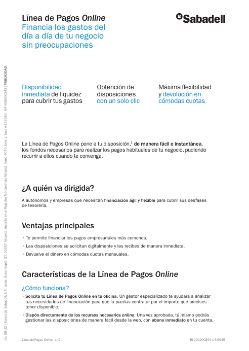 Ha sido especialmente creada para autónomos y empresas que necesitan una financiación ágil y flexible en momentos donde tienen que encajar desfases de tesorería. Financia los pagos empresariales más comunes, las disposiciones se solicitan de forma digital, se reciben al instante y se puede devolver en cuotas mensuales.